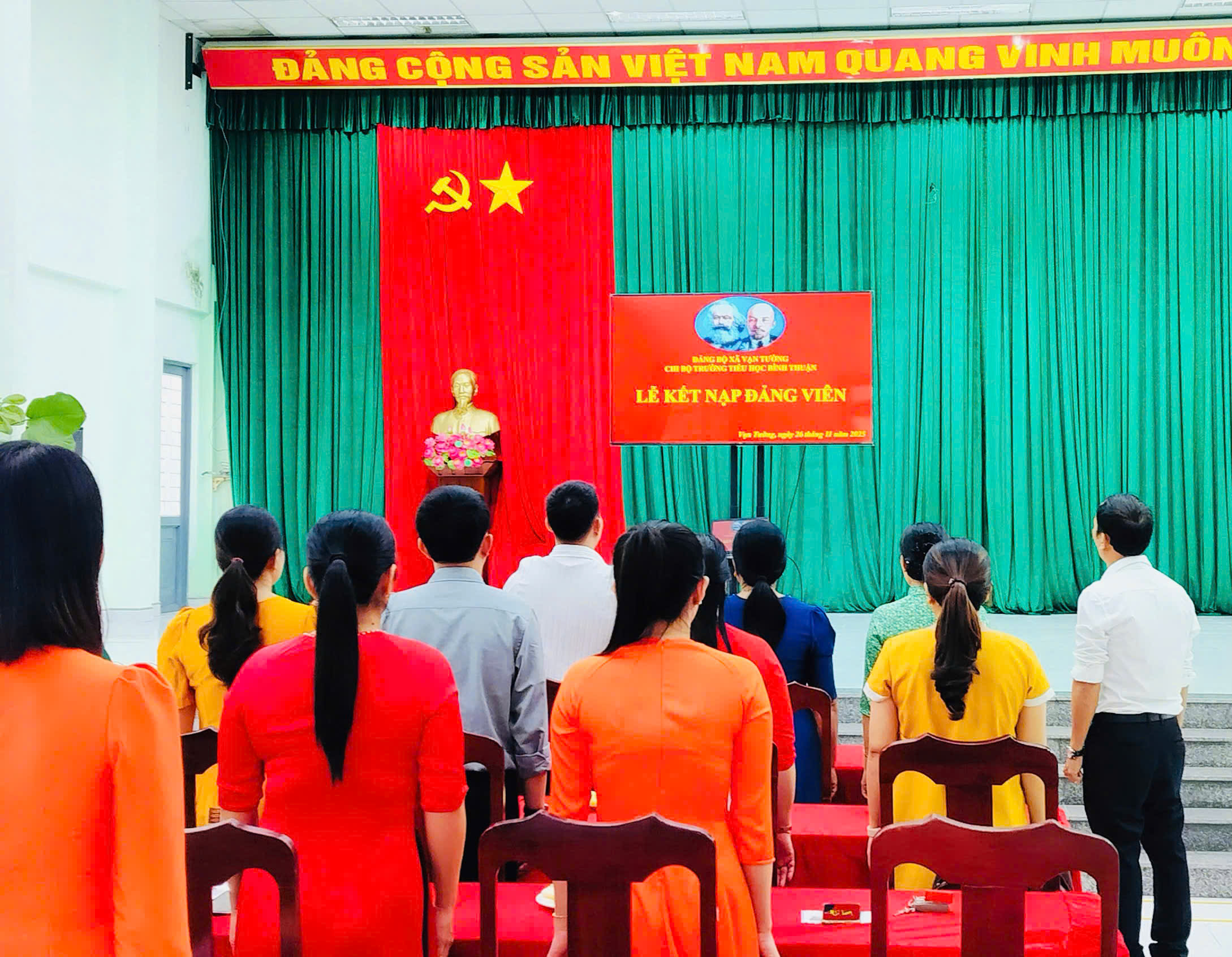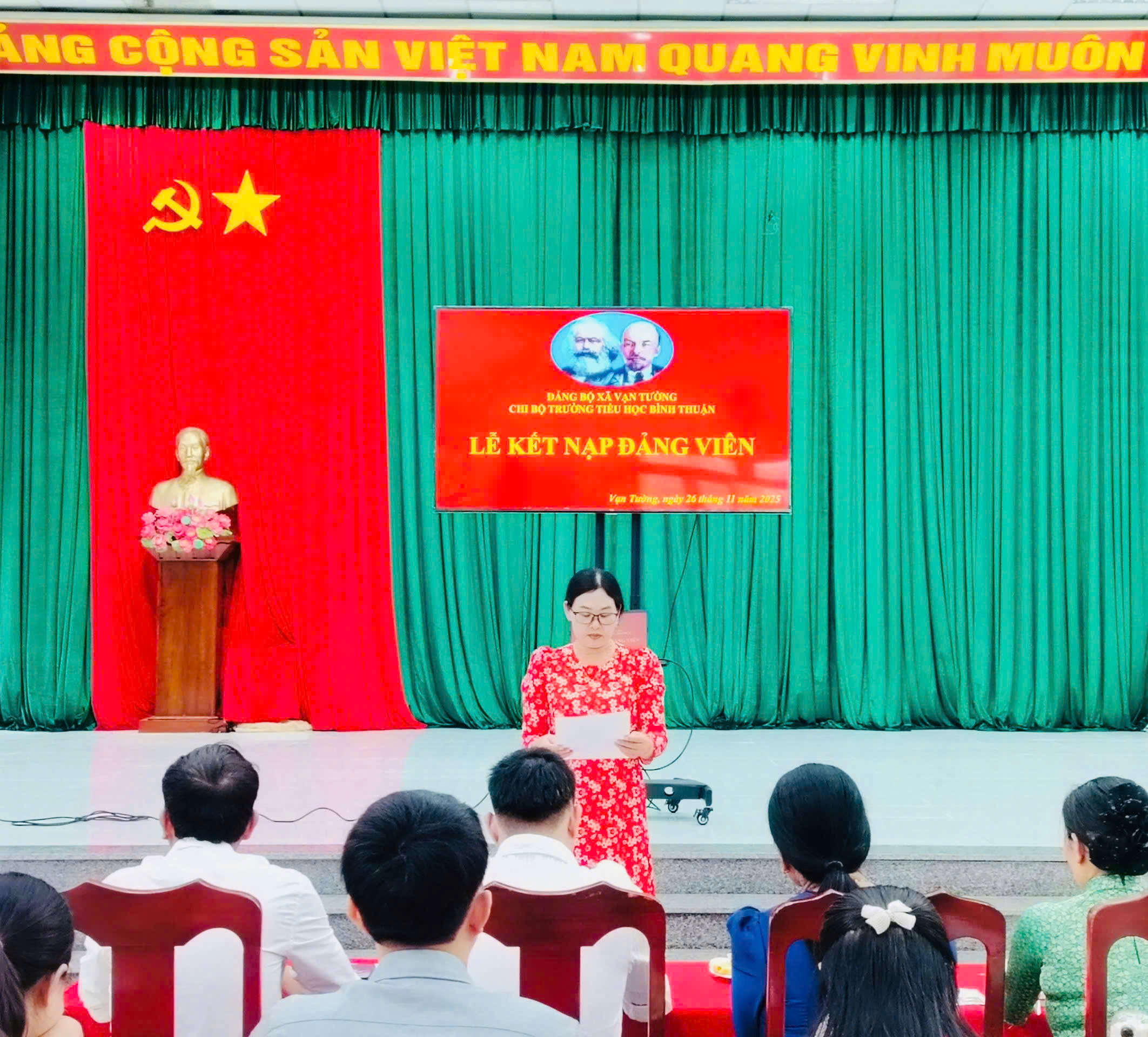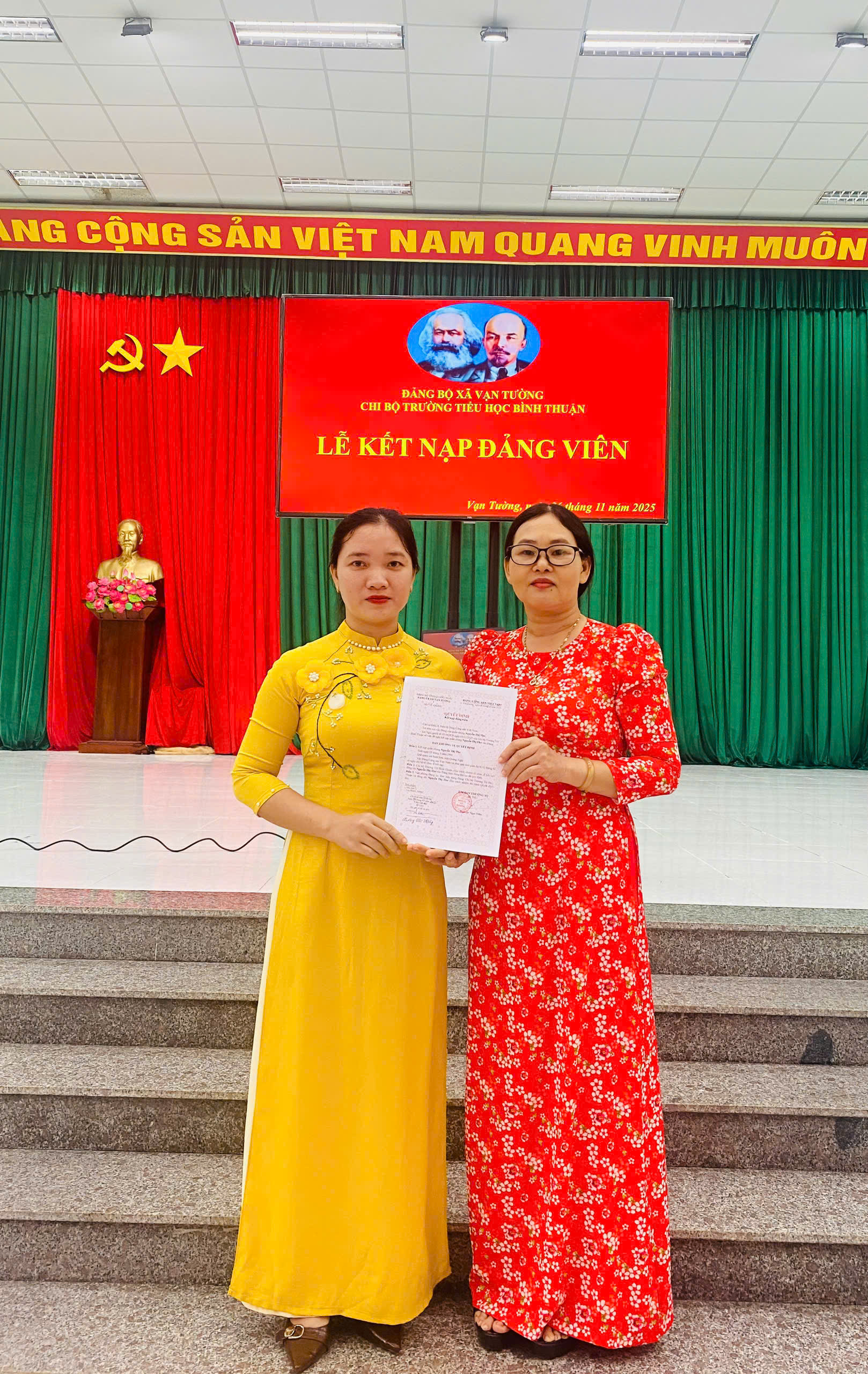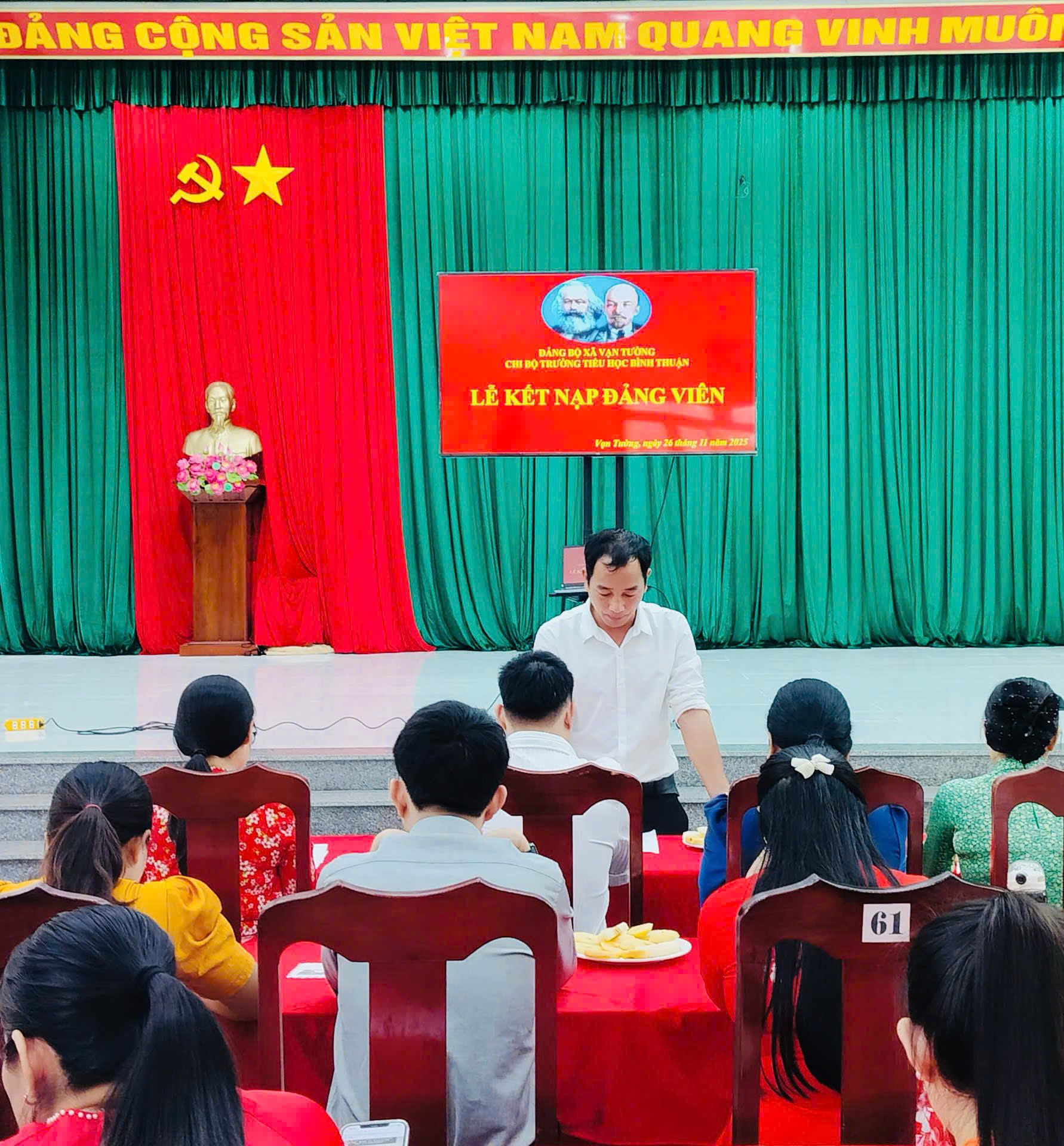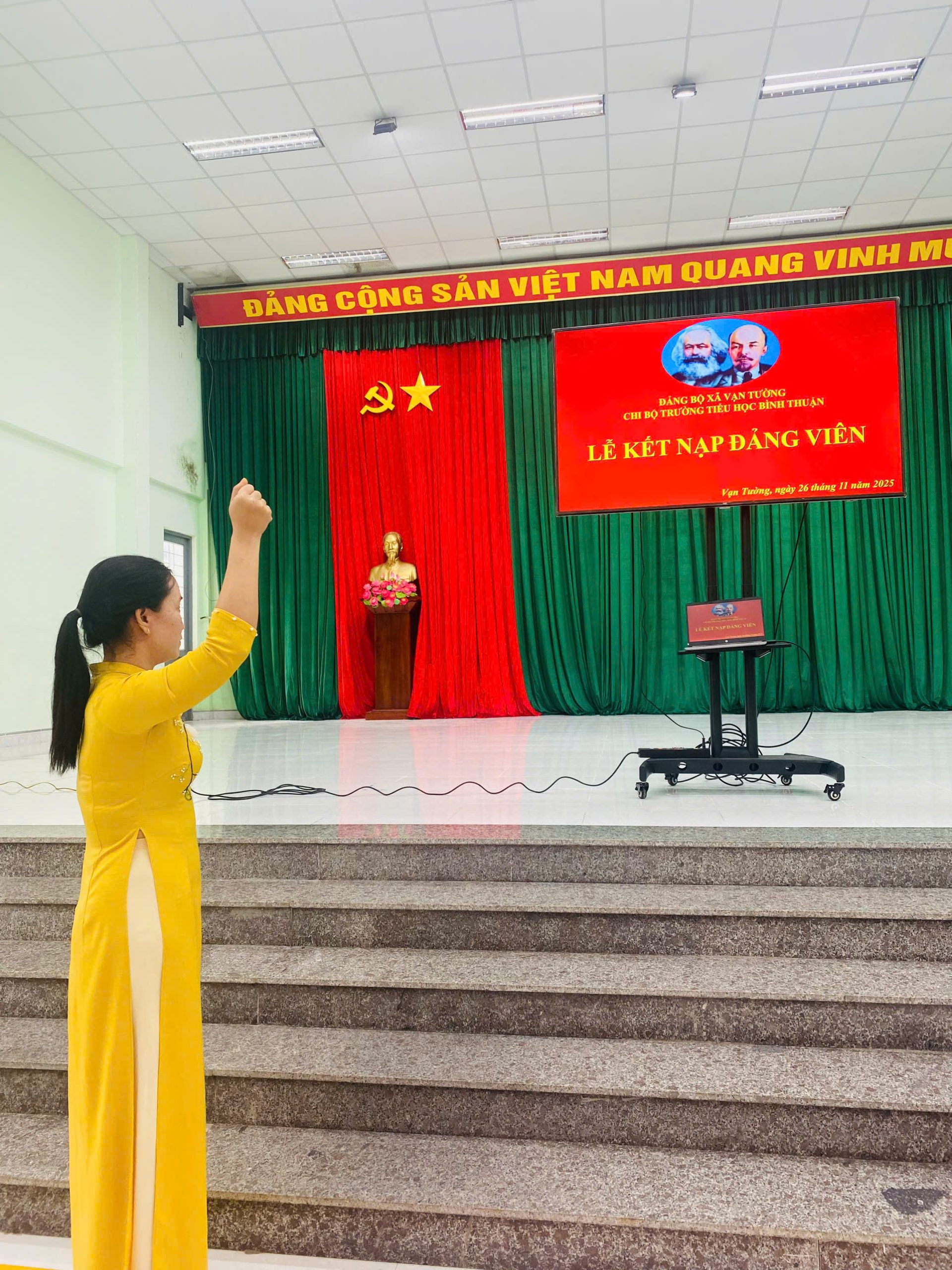 Thực hiện chủ trương phát triển Đảng viên mới của Đảng ủy xã Vạn Tường năm 2025, chiều ngày 26/11/2025, Chi bộ Trường Tiểu học Bình Thuận đã long trọng tổ chức Lễ kết nạp Đảng viên mới cho quần chúng Nguyễn Thị Thơ.